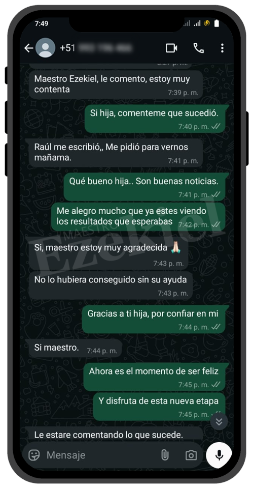 Estaba desesperada porque mi novio me había dejado. Gracias a los testimonios, contacté al Maestro Ezekiel, y en solo dos días, él volvió arrepentido. Da confianza, porque solo pagué los materiales, y me dijo que lo importante era esperar al resultado. Hoy estamos mejor que nunca.