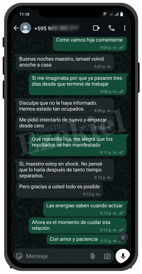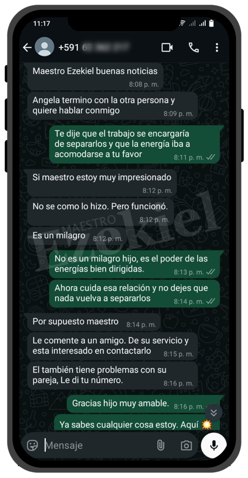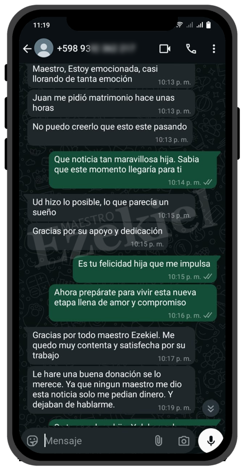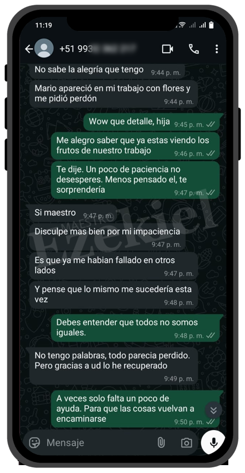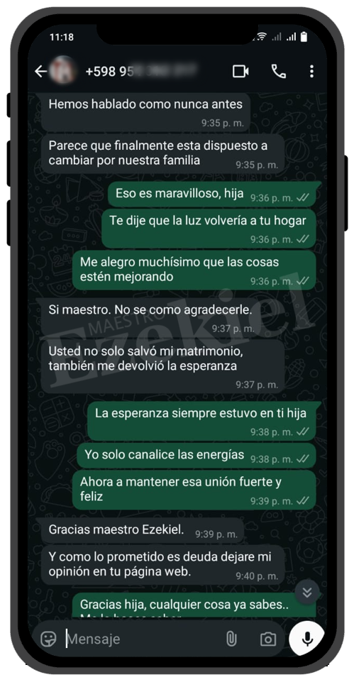 Mi relación estaba destrozada por un maleficio que no conocíamos. Gracias al Maestro Ezekiel, lo descubrió y lo rompió en cuestión de horas. Ahora somos más felices que nunca. Solo pagué los materiales, y voy a donarle más porque realmente lo merece.