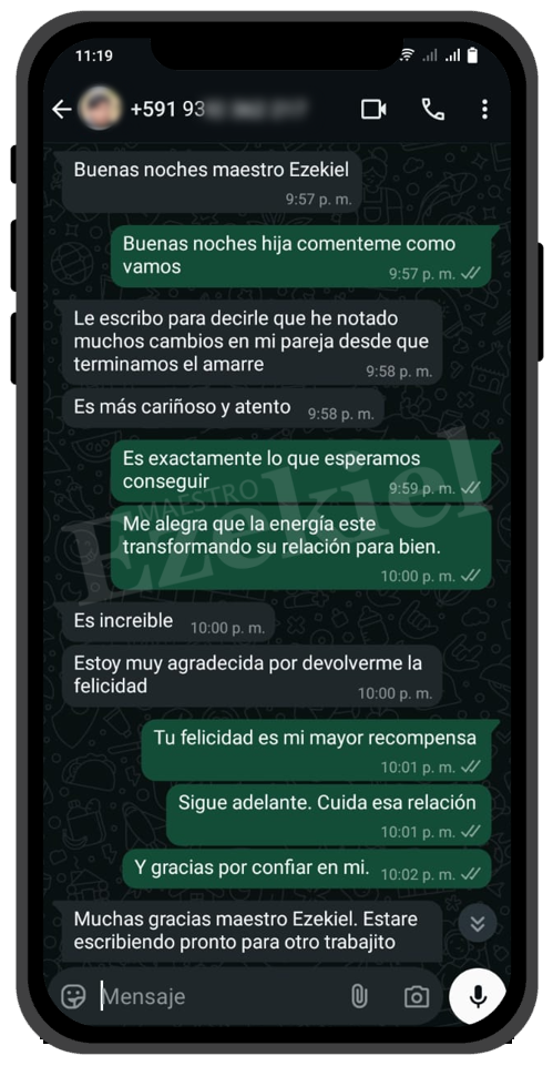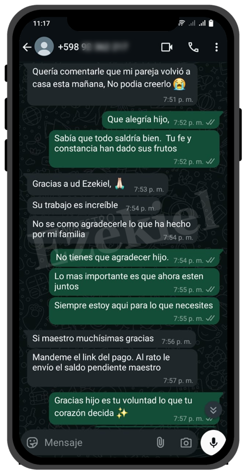 Mi relación estaba destrozada por un maleficio que no conocíamos. Gracias al Maestro Ezekiel, lo descubrió y lo rompió en cuestión de horas. Ahora somos más felices que nunca. Solo pagué los materiales, y voy a donarle más porque realmente lo merece.